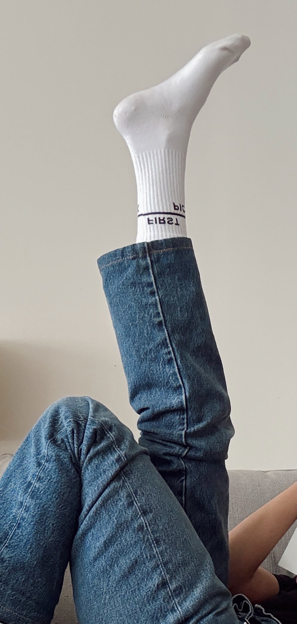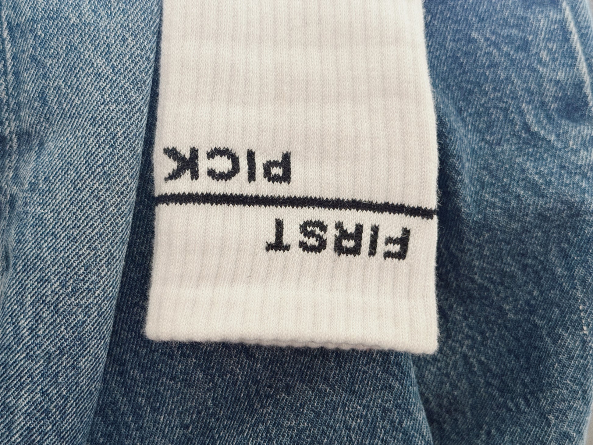 Step up your game with these crisp white socks, featuring bold First Pick branding. Designed fir comfort and style, they're perfect for any occasion.